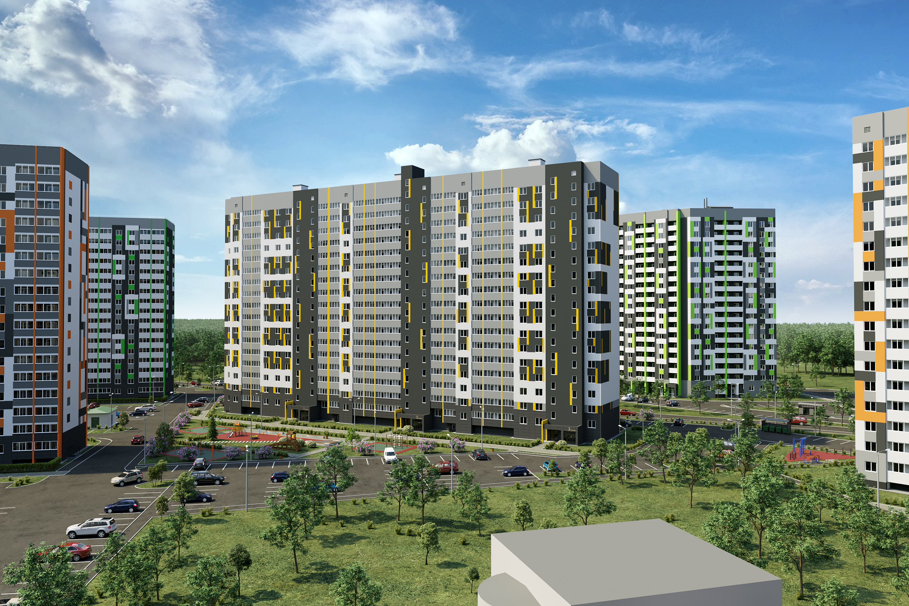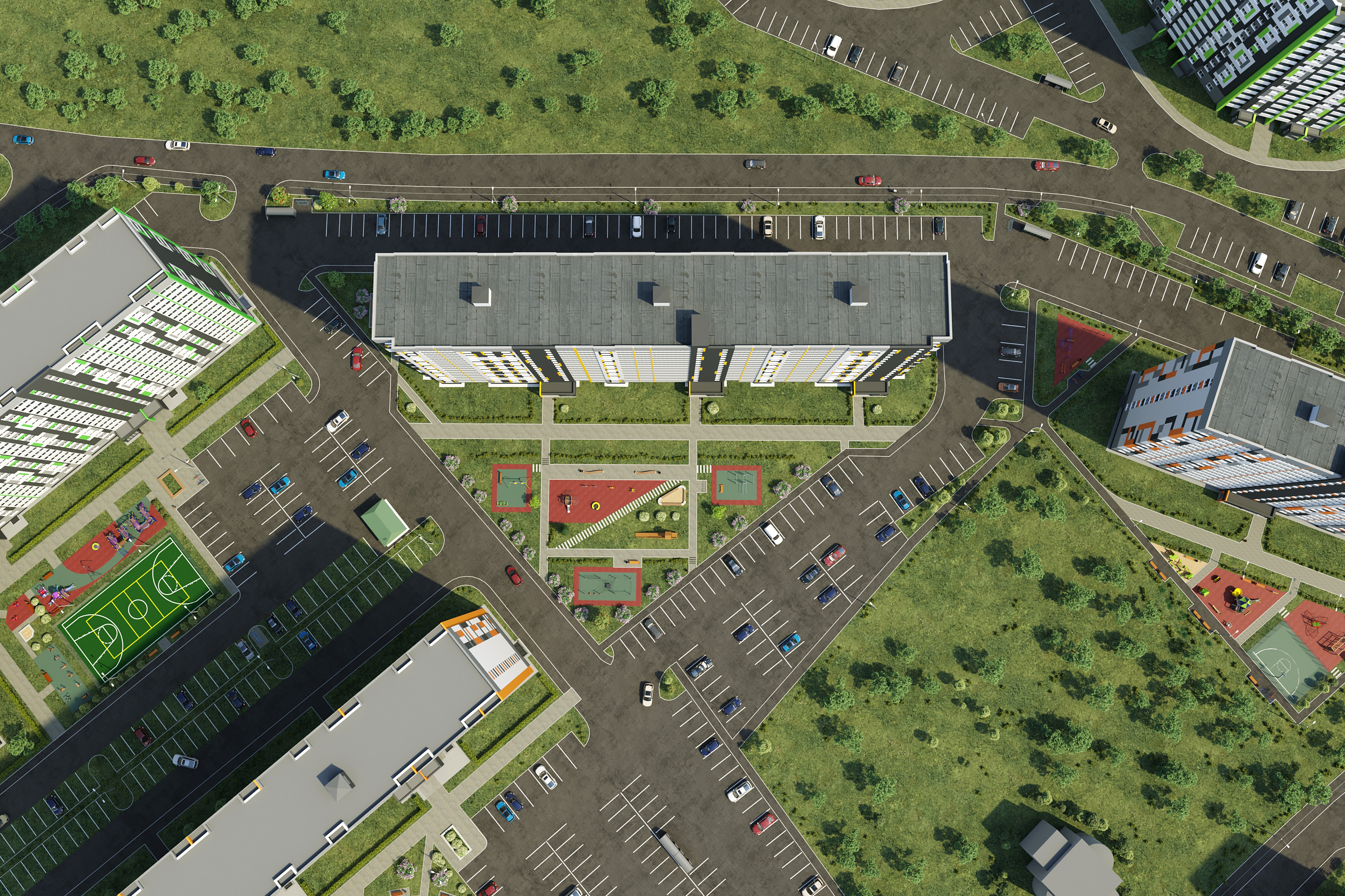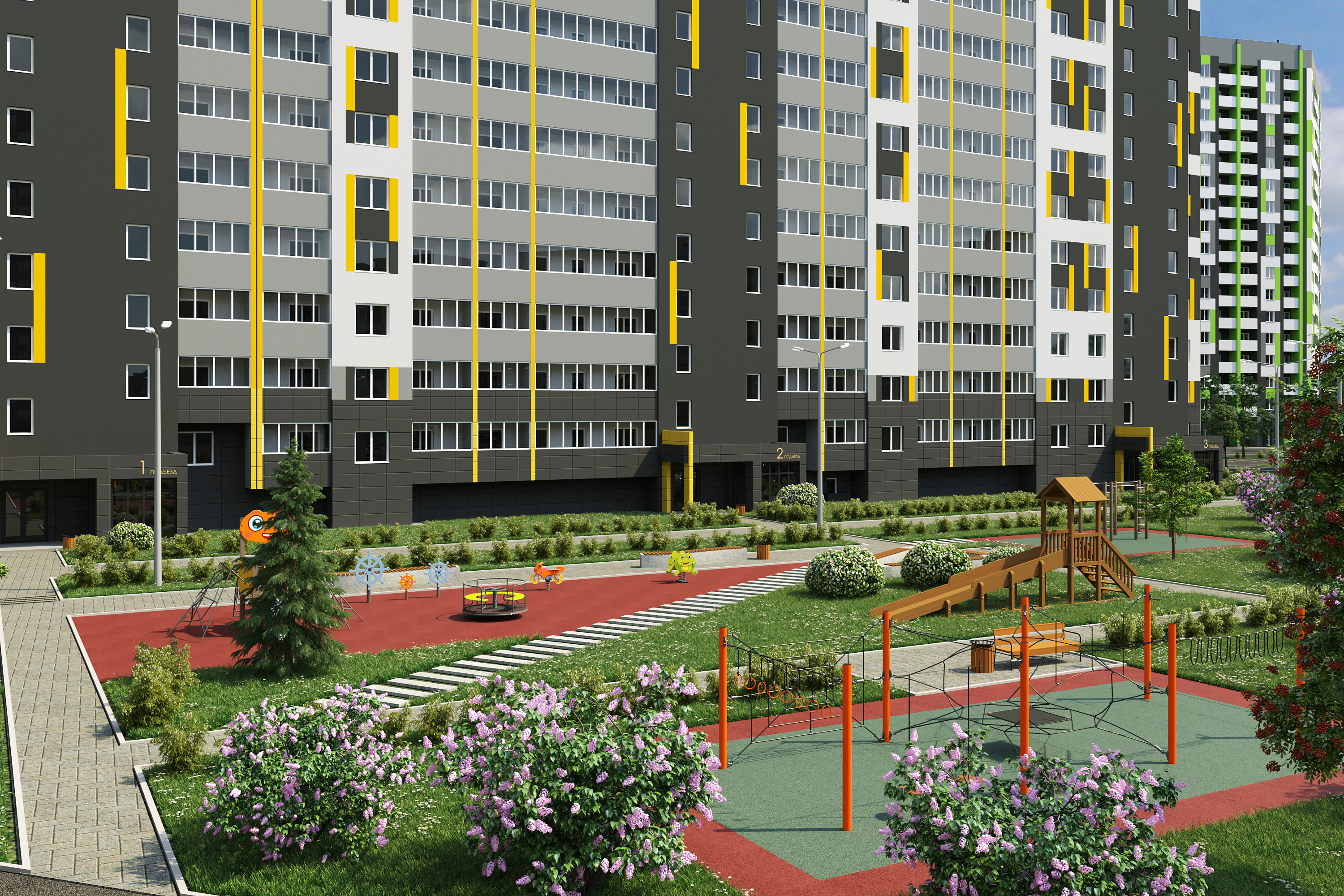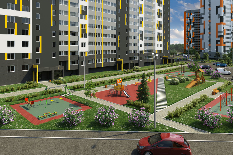 - двор без машин с уютными пешеходными, игровыми и спортивными зонами