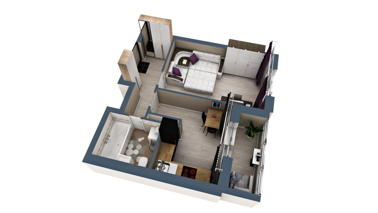 Однокомнатная квартира (38,7 кв.м) - это квартира с совмещенным санузлом, большой жилой комнатой и просторной прихожей. Окна квартиры выходят на внешнюю сторону дома. На кухне расположен выход на лоджию.