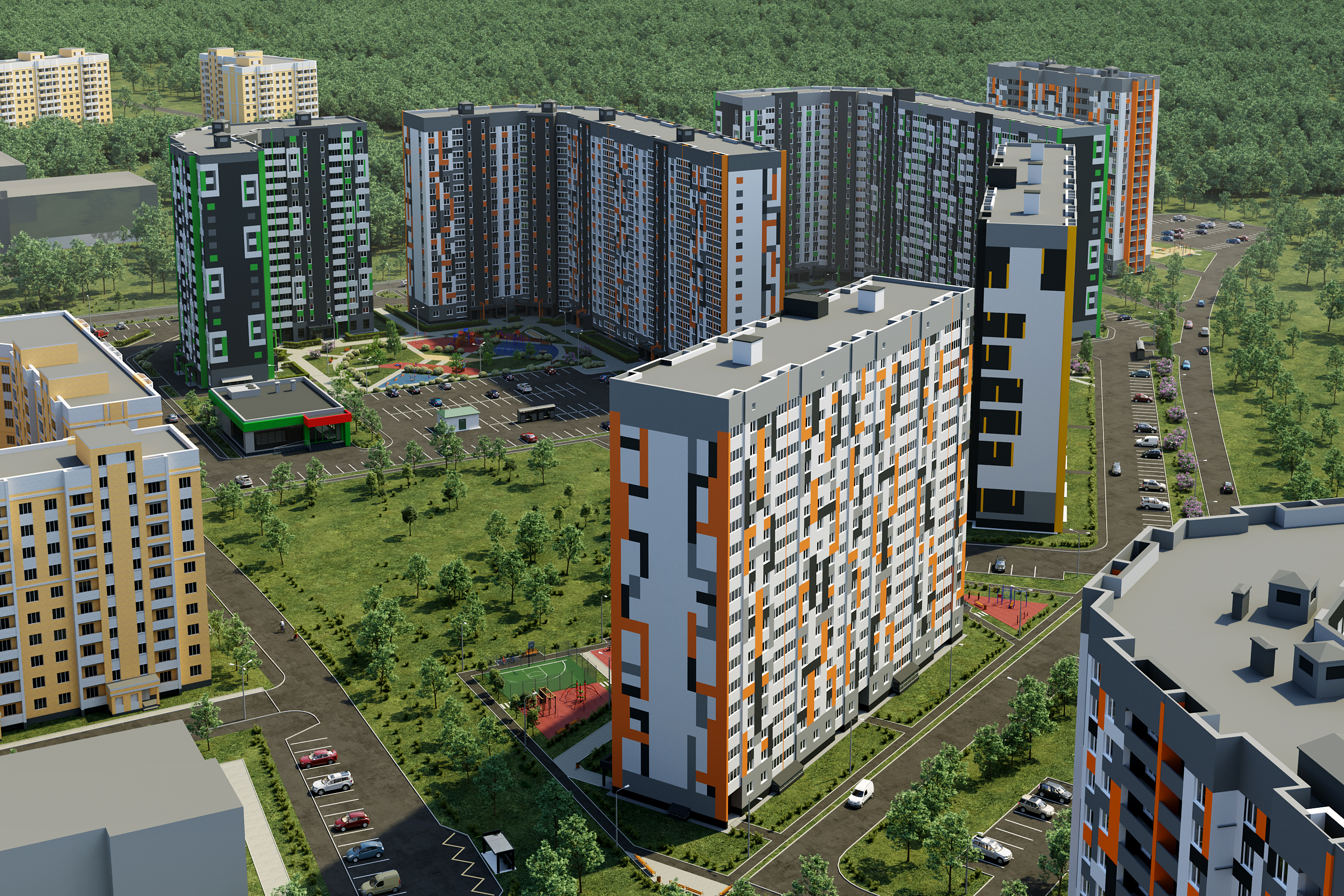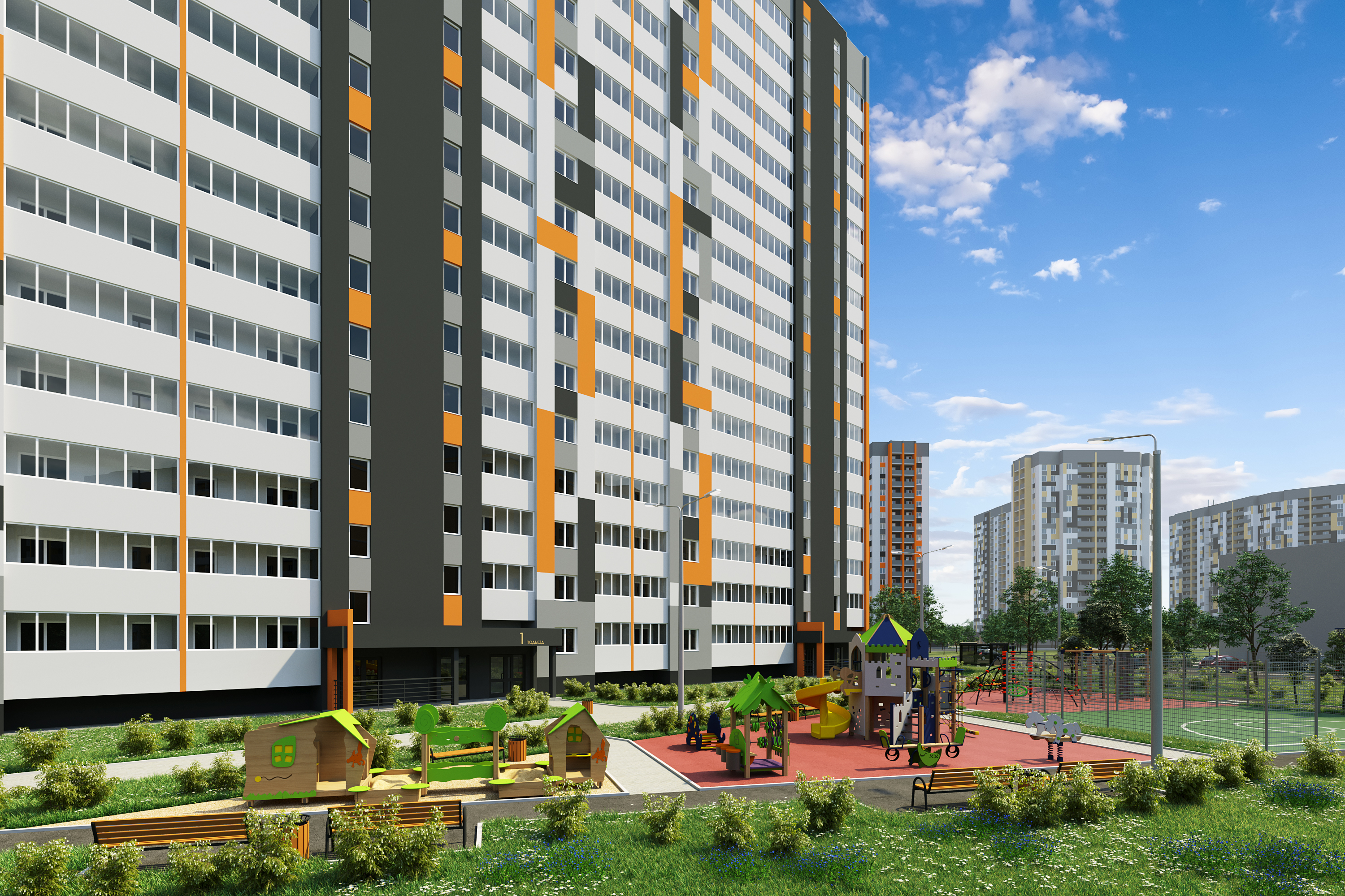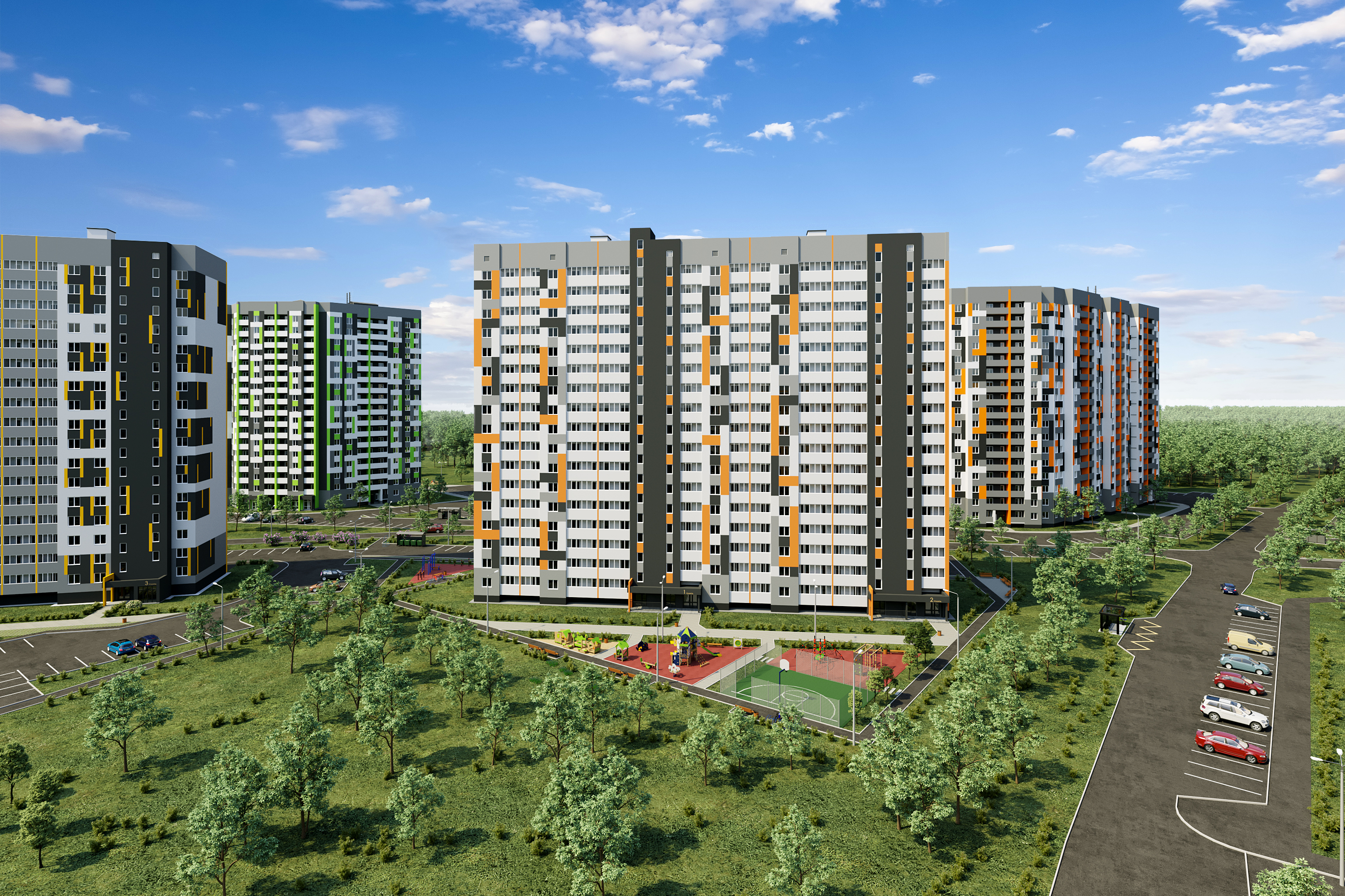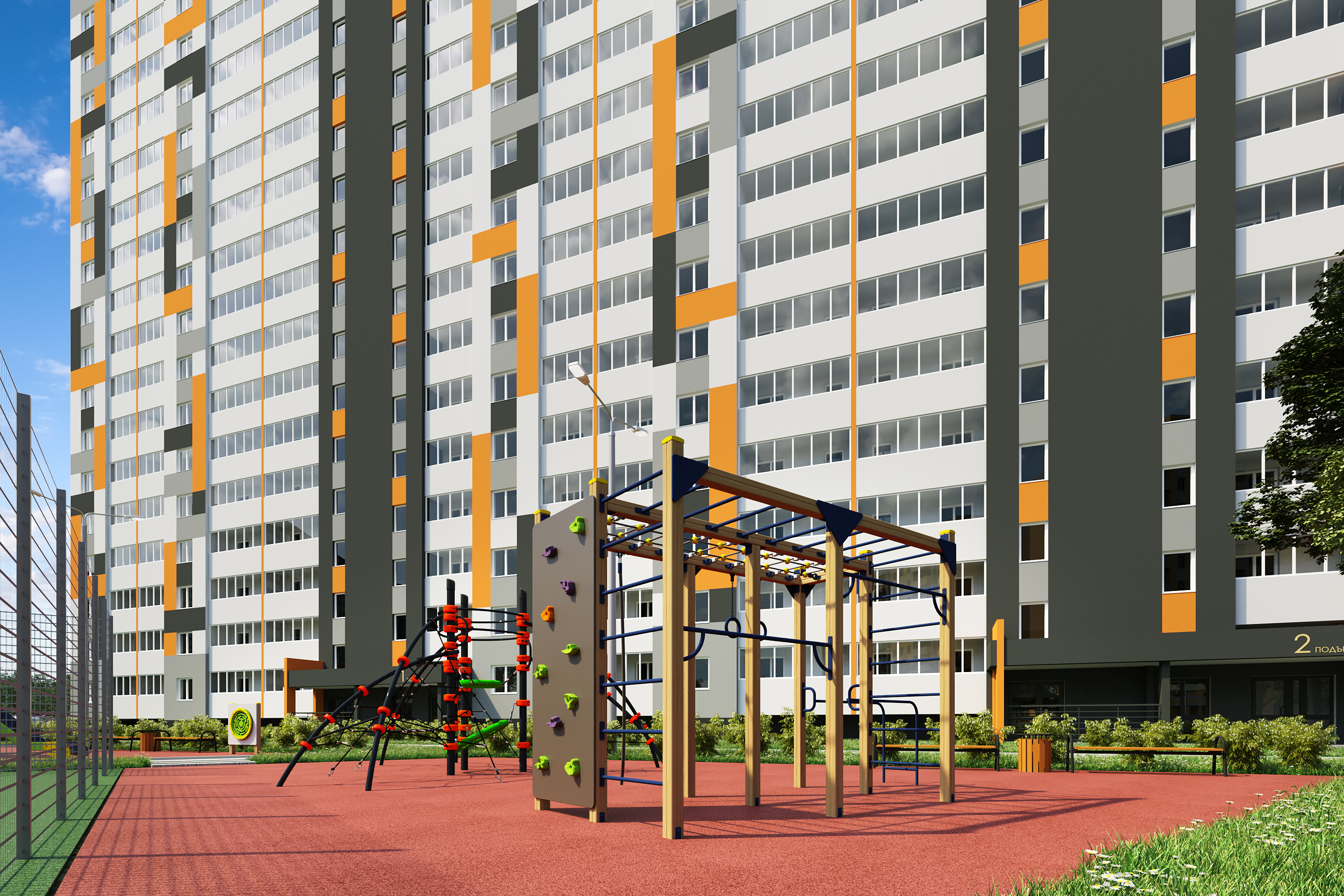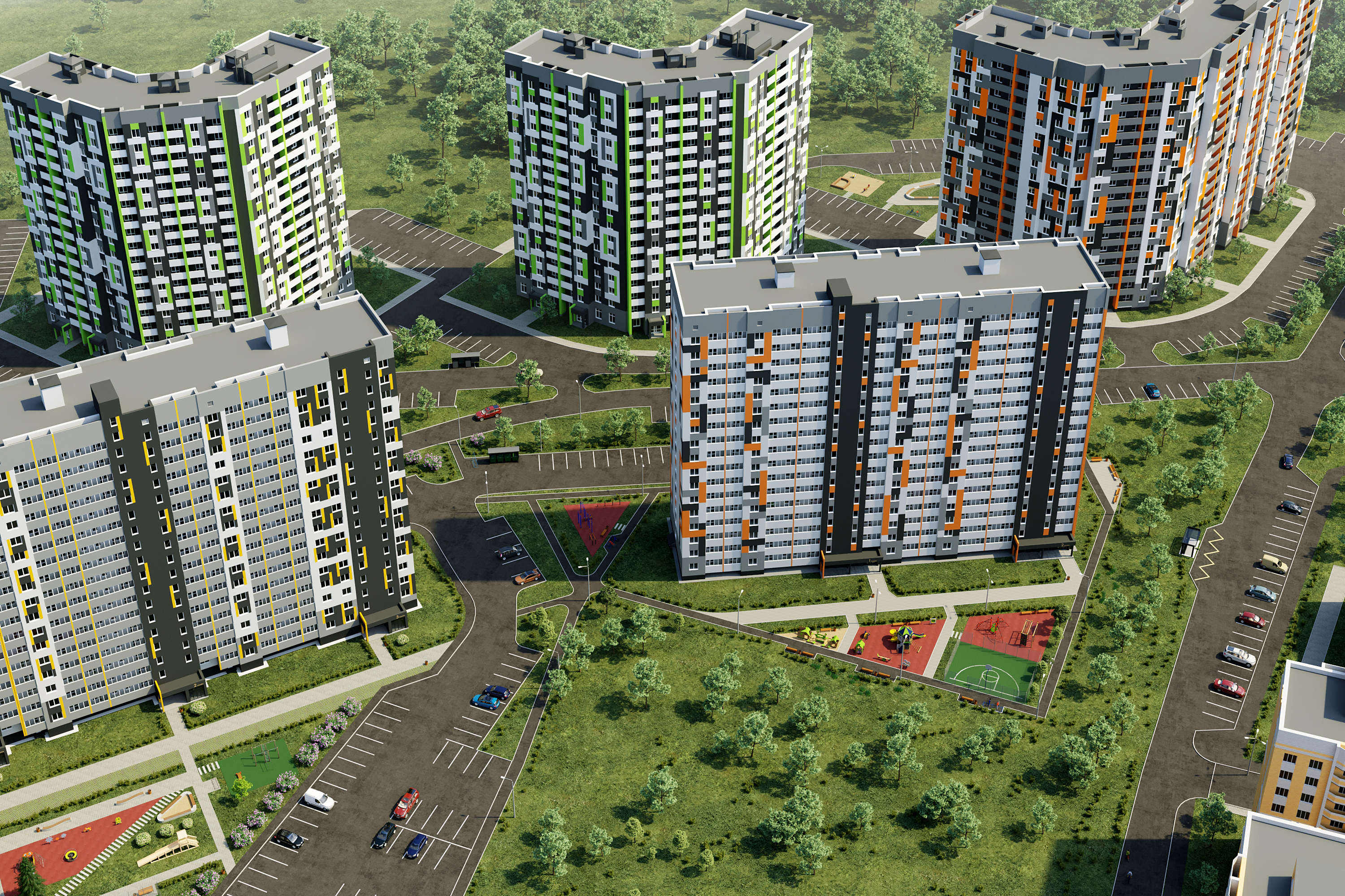 — двор без машин с уютными пешеходными, игровыми и спортивными зонами