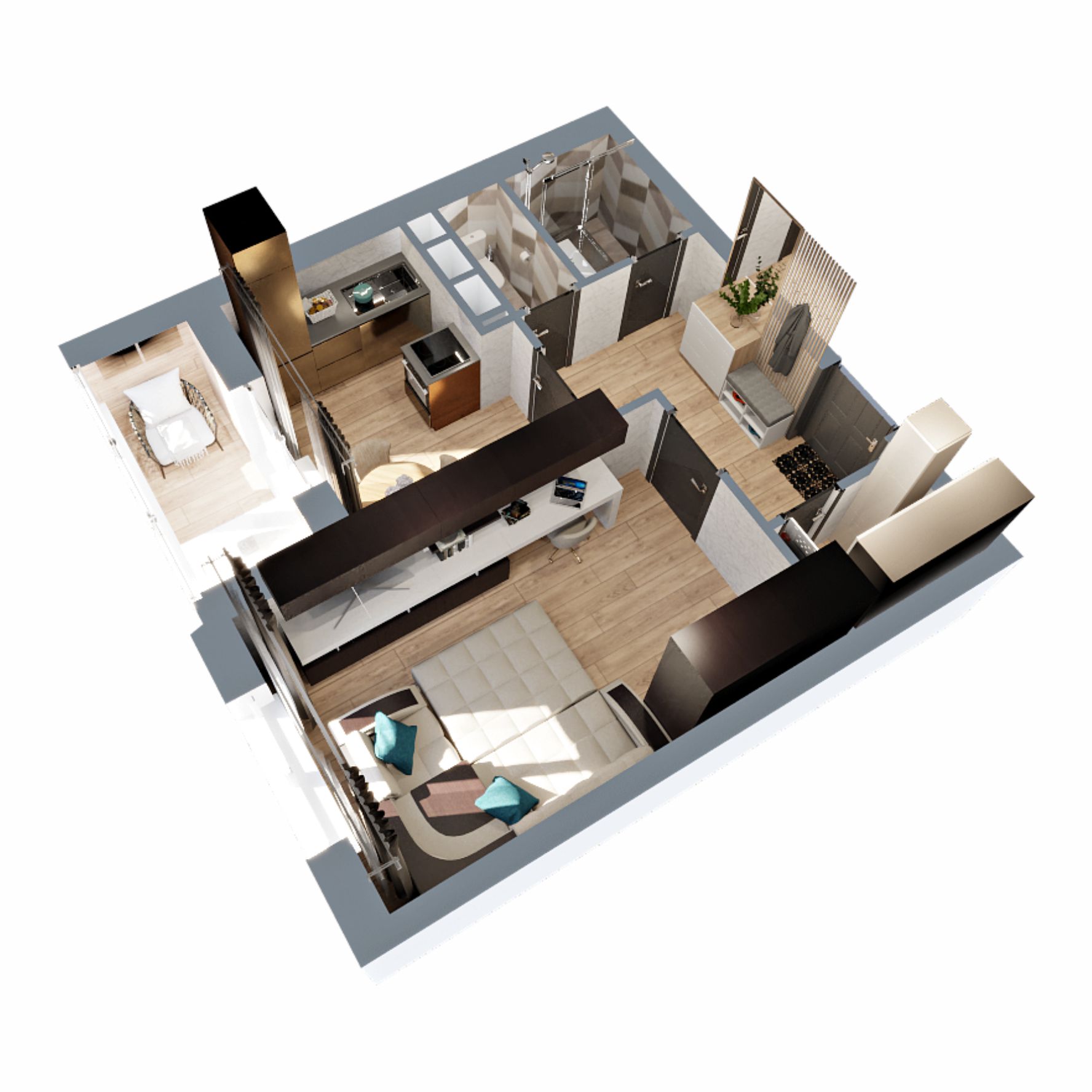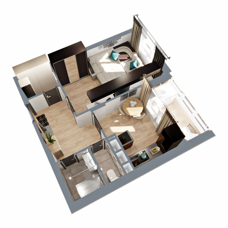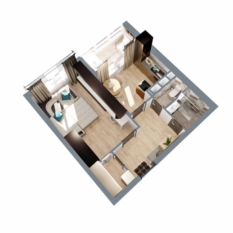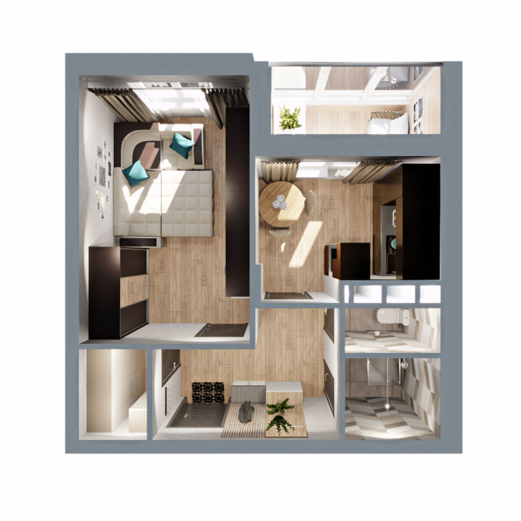 Это квартира с гардеробной, небольшой кухней и просторной жилой комнатой 15 кв.м. Лоджия с выходом их кухни и раздельный санузел.