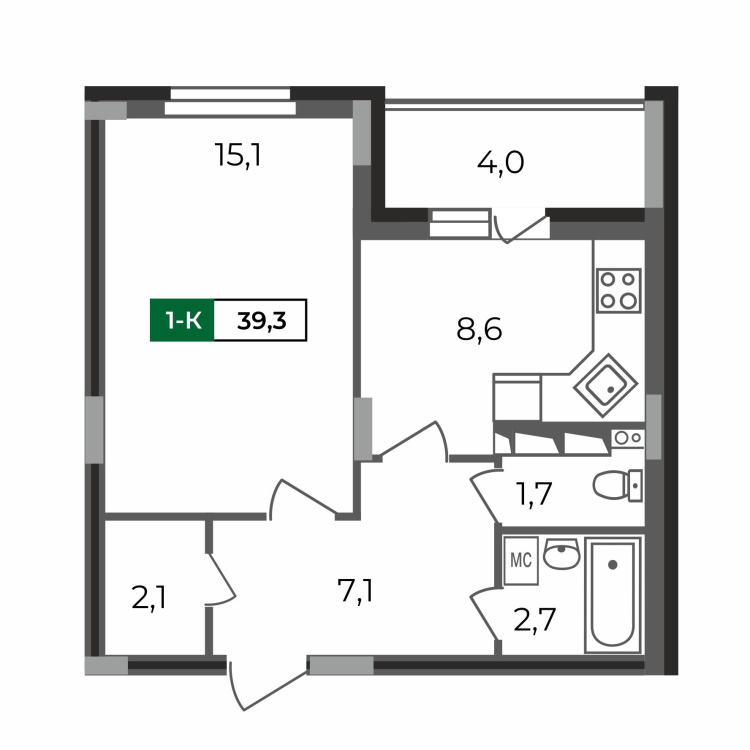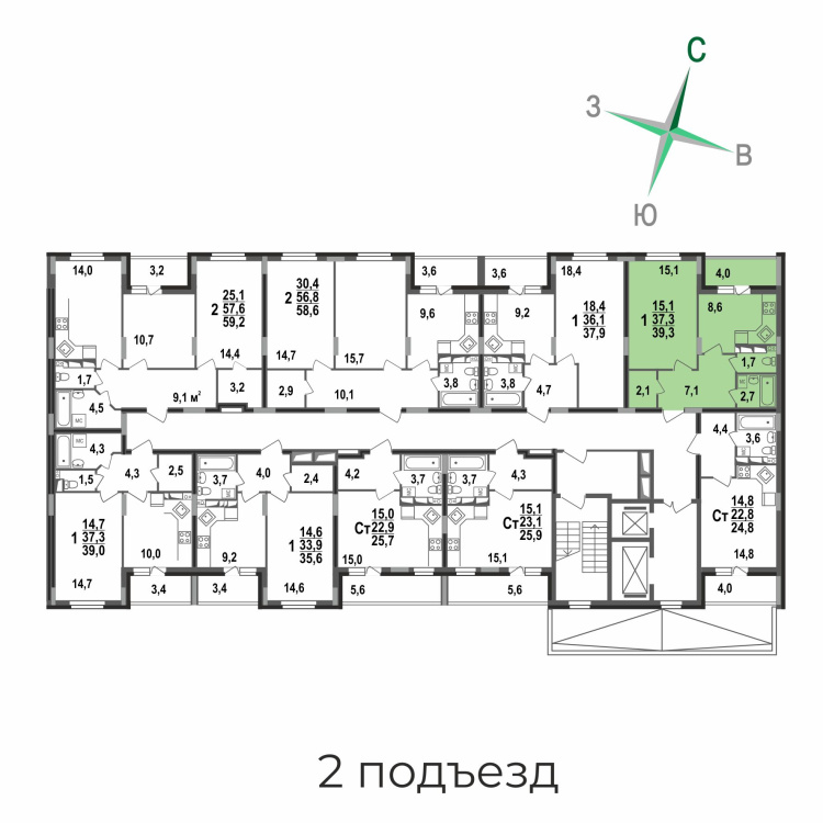 1-комнатная квартира 39,3 кв.м во 2 подъезде ЖК «Сталинградский бульвар 5».