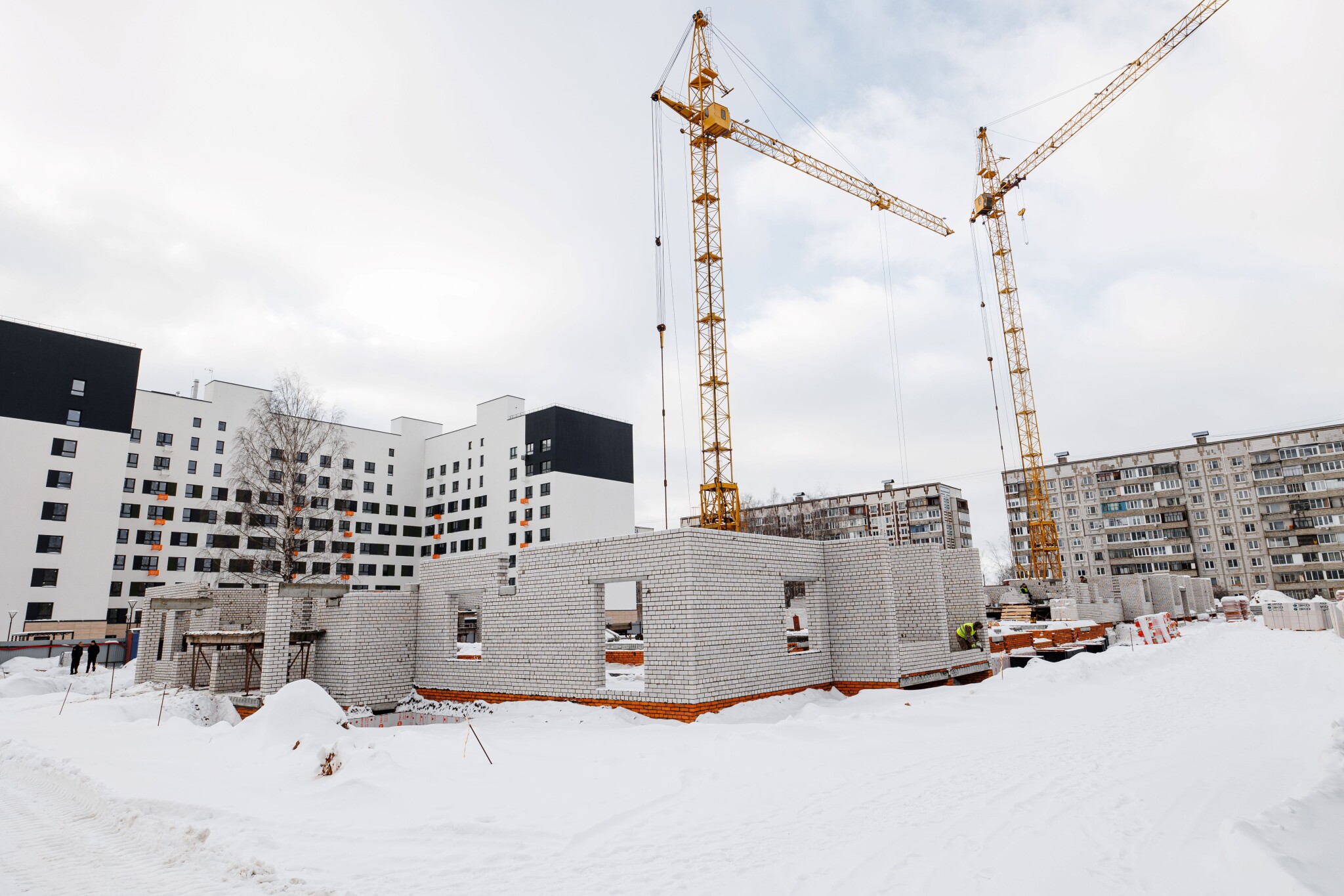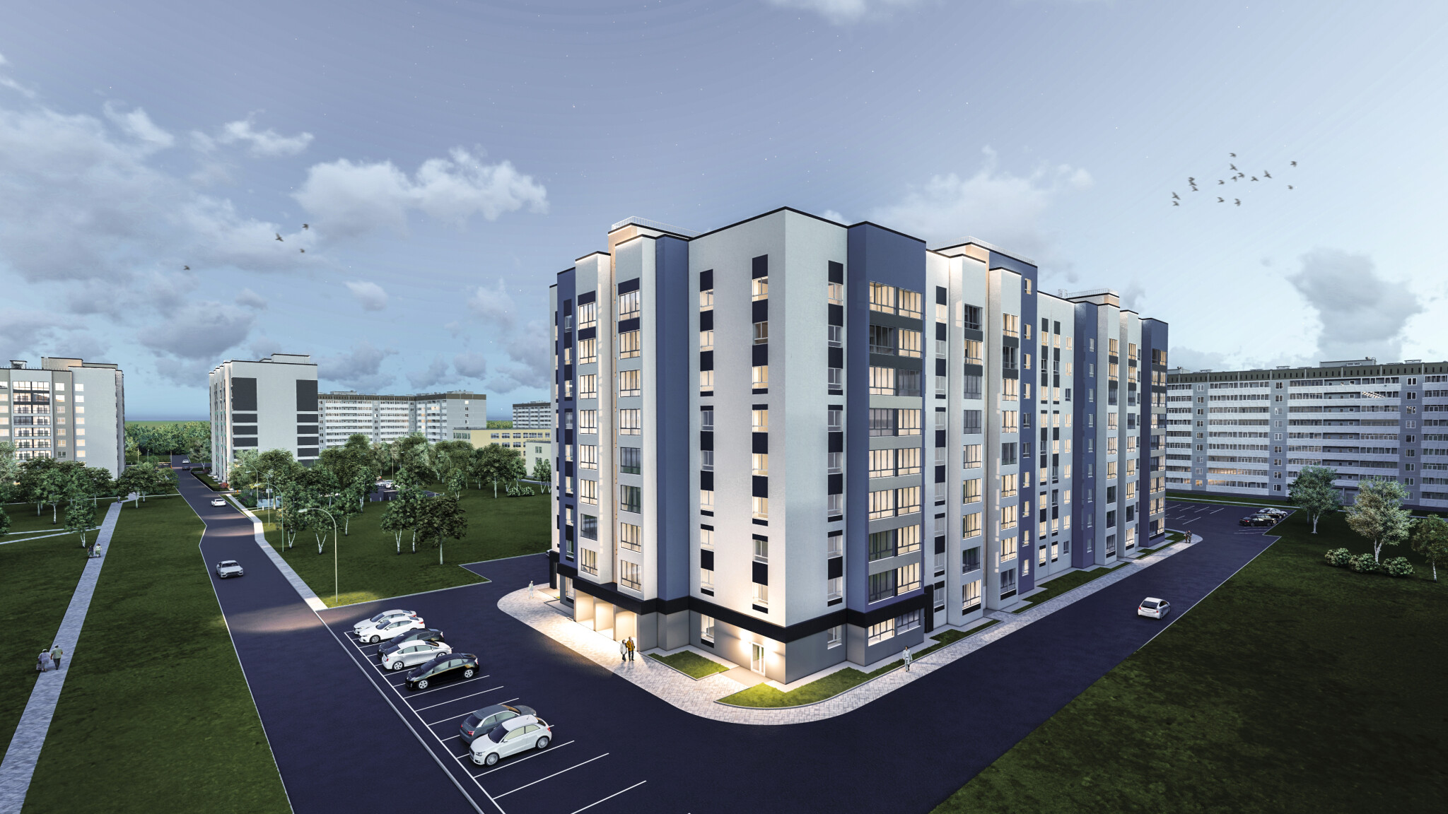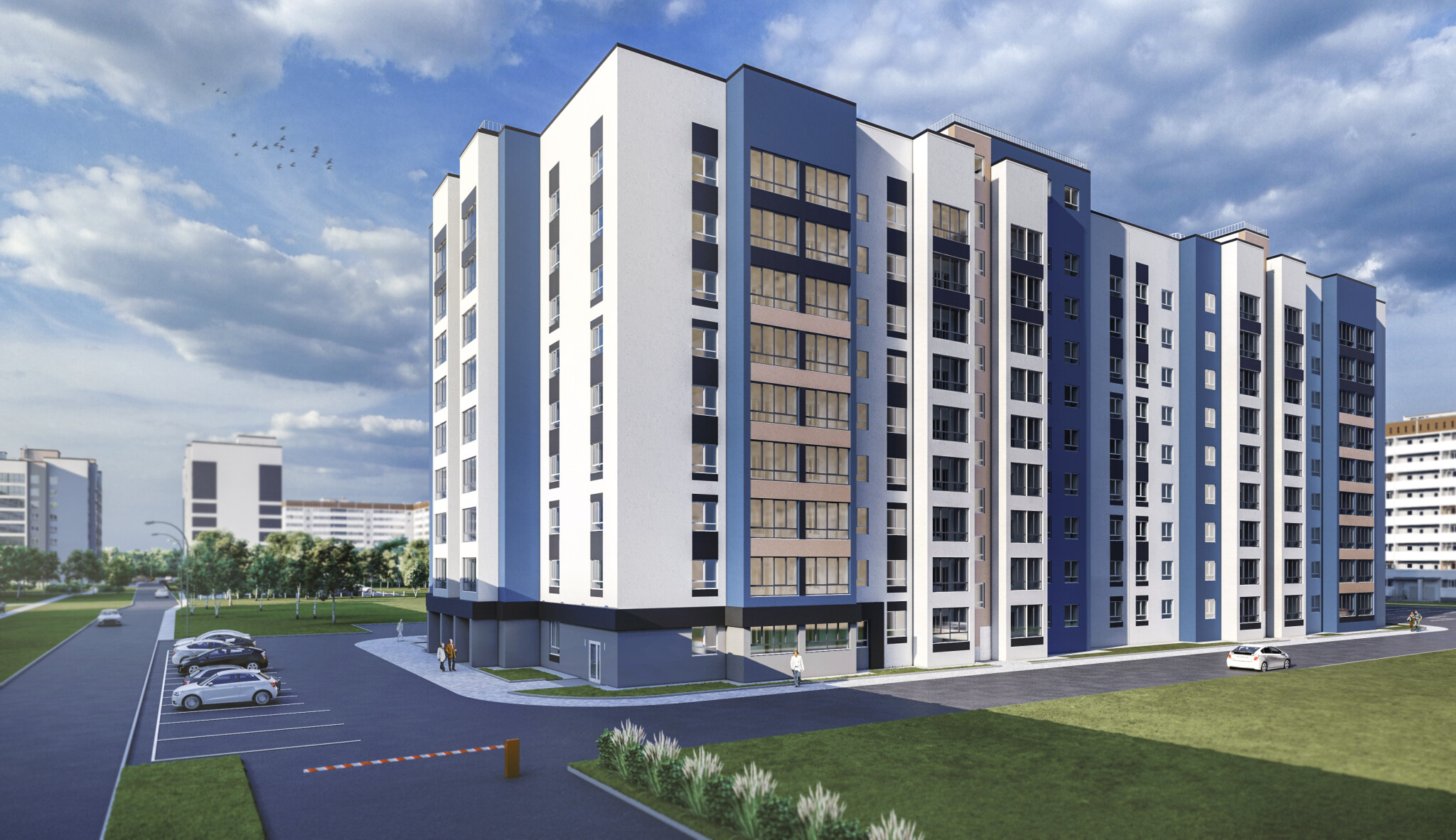 Полностью кирпичный 2-секционный 10-этажный дом с собственной крышной котельной на 219 квартир.Наружная отделка здания предусмотрена из минераловатных жестких плит толщиной 120 мм и последующей декоративной штукатуркой типа “Короед” по системе «Сэнарджи» В каждой секции по 2 грузопассажирских лифта и по 3 входных группы.В каждом подъезде есть просторная колясочная. В доме 1 подвальный этаж с кладовыми помещениями и 9 жилых этажей.