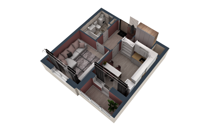 Однокомнатная квартира (38,3 кв.м) - это квартира с гардеробной и совмещенным санузлом. Окна квартиры выходят на внешнюю сторону дома. Кухня и жилая комната имеют примерно одинаковую площадь.