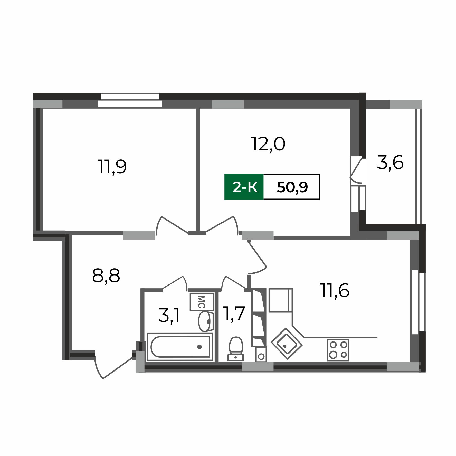 Классическая двухкомнатная квартира 50,9 кв.м на две стороны. В квартире кухня 11,6 кв.м, раздельный санузел, удобная прихожая с нишей для шкафа-купе и 2 спальни по 12 кв.м, в одной из которых предусмотрен выход на лоджию.
