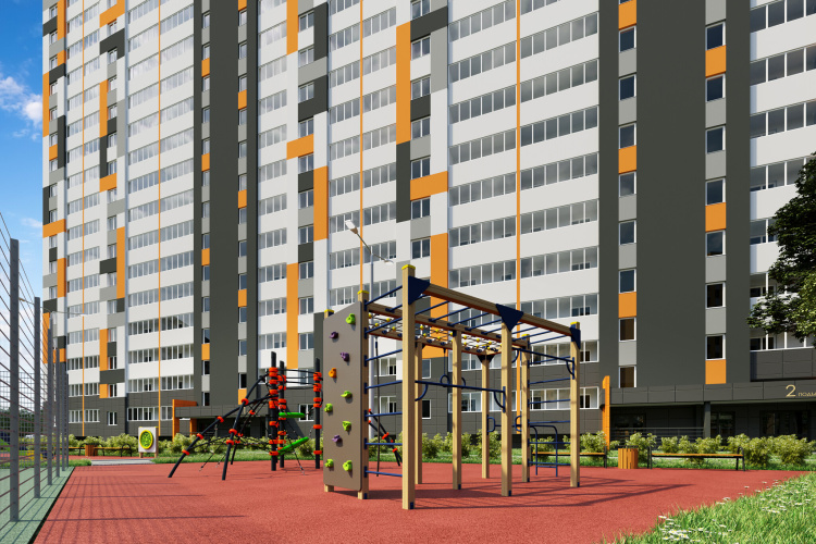 Двор без машин и уютными пешеходными, игровыми и спортивными зонами.
